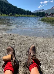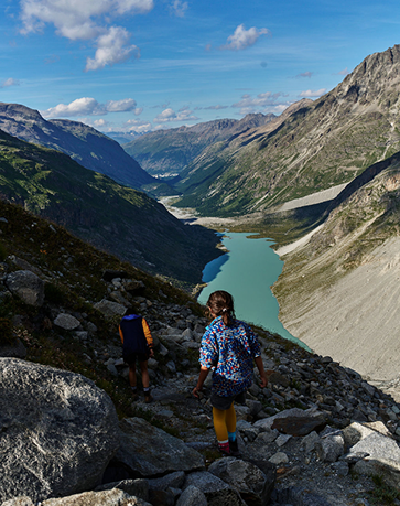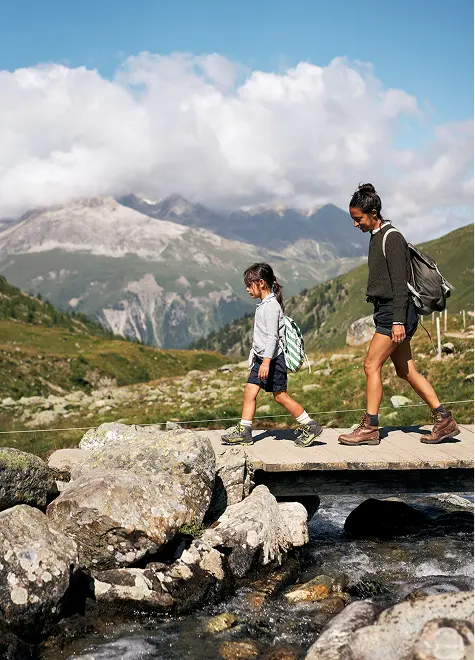 After resting, we resume our journey and begin the descent through Val Roseg, an extraordinary natural park, a sanctuary of peace immersed in the purest nature. The trail winds gently through forests and streams, and halfway down, we find our favorite spot: a small clearing by the river, where we stop to build dams with stones and bask in the sun. The sound of the water resonates in Anita’s hands as she shapes the current with small improvised barriers, blending with our laughter and the rustling wind through the trees. We stretch out on the grass, letting the sun warm our faces, enjoying one last pause before continuing toward the valley floor.